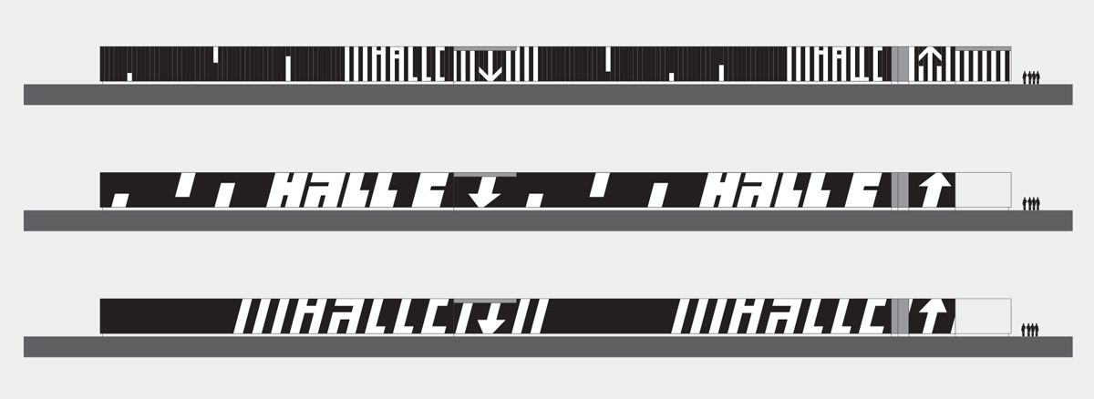 Nous avons proposé pour le concours, un système de façade construit de manière binaire, avec des éléments noirs et des éléments blancs, en réalité translucides, donc pouvant être considérés comme vides. Cela renvoie à la typographie, car comme souvent, le vide qui crée des « temps », est l’élément rythmique le plus important. Comme le dit Gerrit Noordzij, écrire ce n’est pas tracer des traits noirs mais c’est organiser un espace vide avec des traits noirs1. C’est donc vraiment une manière de prendre les choses au pied de la lettre, nous avons fait une sorte de « boîte » composée de deux matériaux, un bardage acier laqué noir et un autre en plastique translucide appelé Danpalon® laissant passer la lumière mais pas vraiment la vision. Nous avons procédé à ce jeu binaire, avec des lettres mélangeant capitales et minuscules sur une trame de 15° ; il s’agissait de lames verticales et d’autres légèrement inclinées, déclinant la lettre « c », le « h » de hall ou encore « hall C » et qui entouraient le bâtiment.